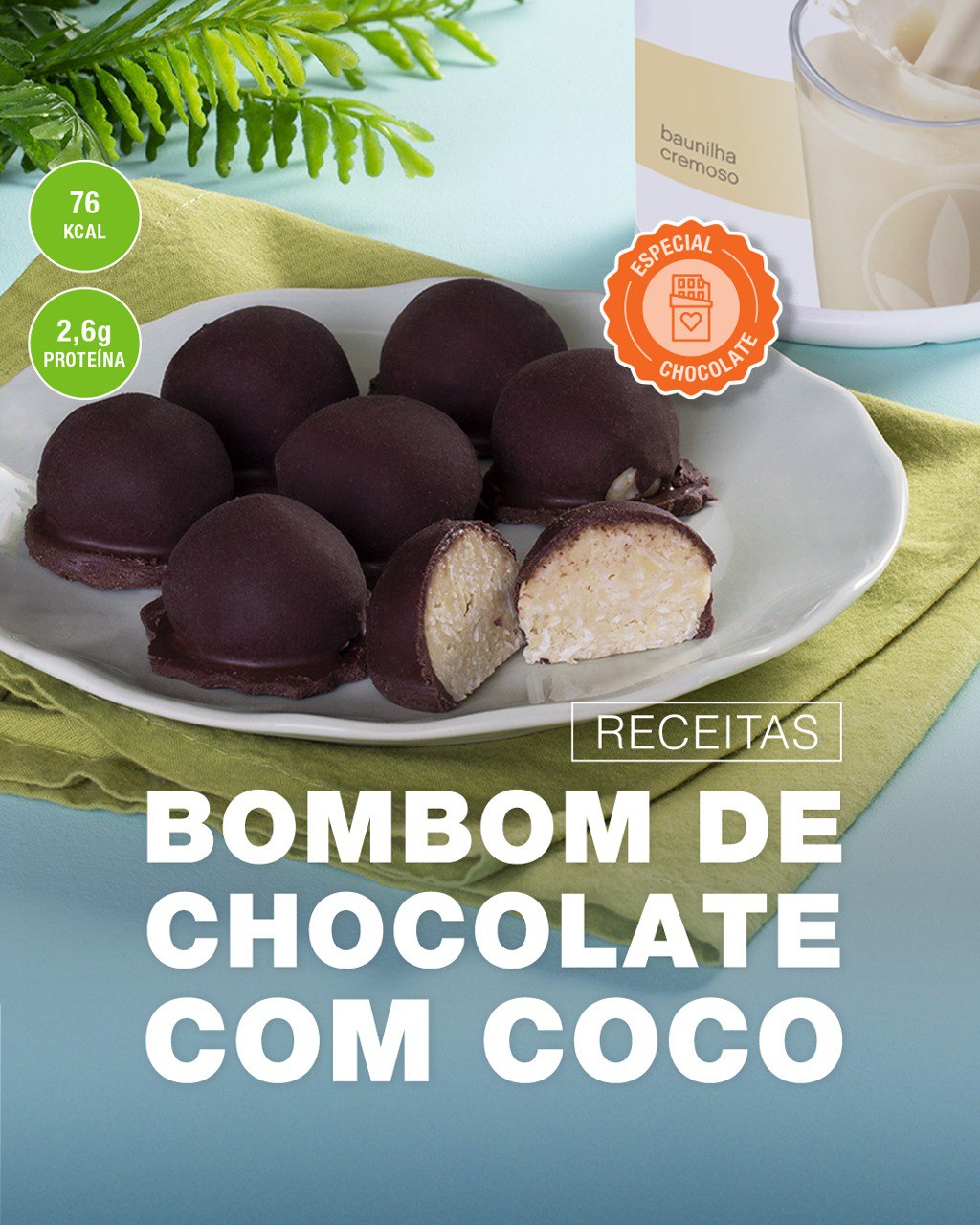 Misture delicadamente todos os ingredientes da massa. Depois de obter uma mistura homogênea, molde bolinhas, distribua em um refratário e leve para a geladeira por alguns minutos. Para a cobertura, misture o Shake Chocolate Sensation com óleo de coco para formar uma pasta com textura de chocolate derretido. Mergulhe as bolinhas nesta mistura até que elas fiquem totalmente cobertas e leve para a geladeira por mais ou menos 1 hora antes de servir (ou até a cobertura endurecer).